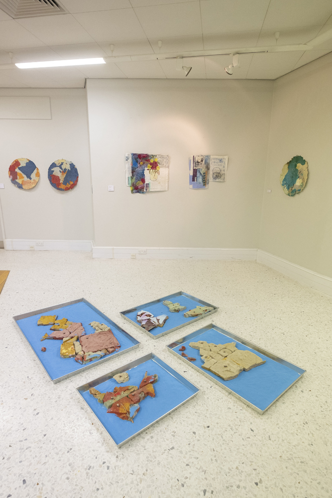 The floor pieces and the wall mounted paper pieces are linked as they both represent re-imagined landscapes.
