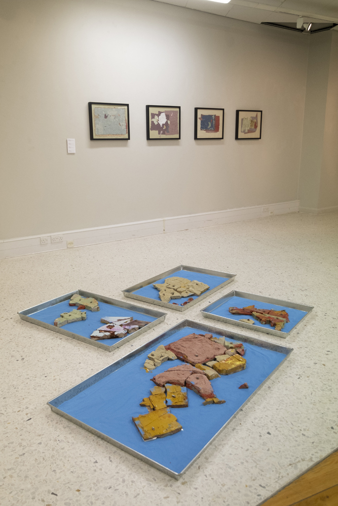 The floor pieces and the wall mounted paper pieces are linked as they both represent re-imagined landscapes.