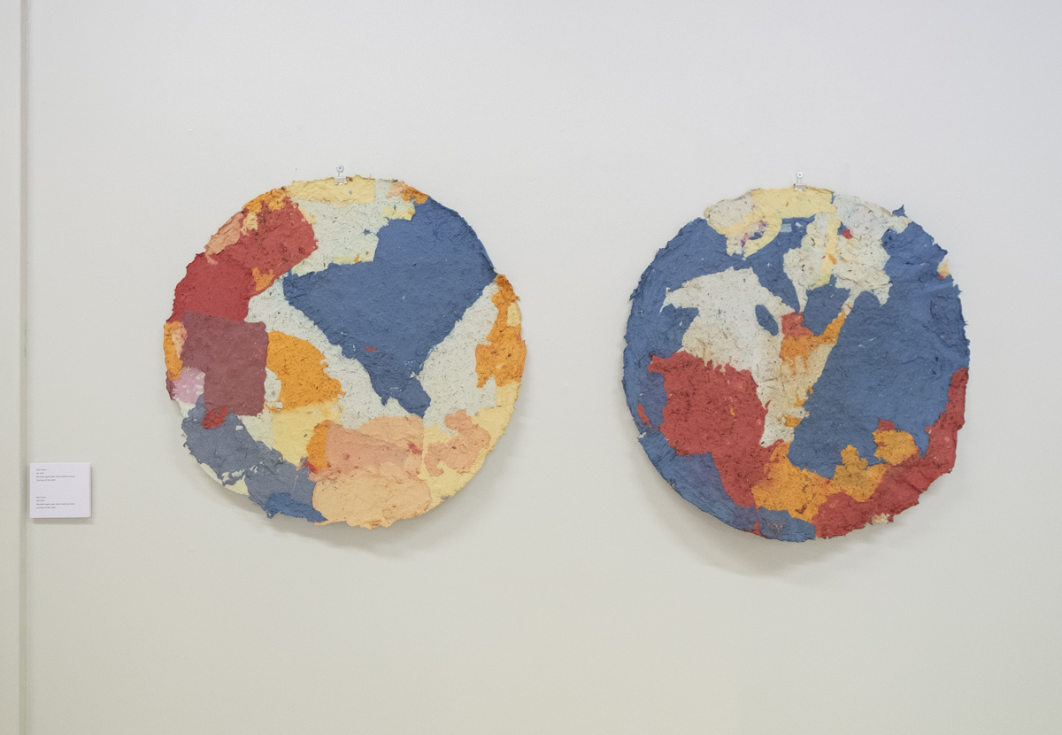 The floor pieces and the wall mounted paper pieces are linked as they both represent re-imagined landscapes.