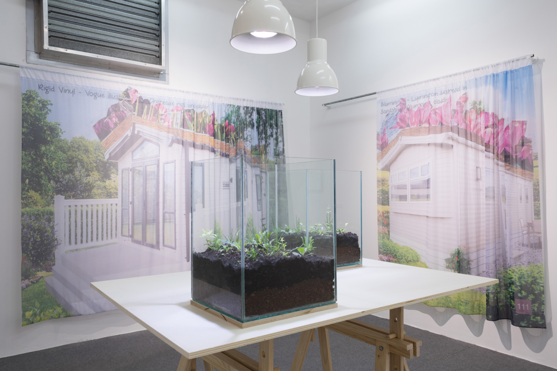 Wood, metal ultraviolet lighting, glass, soil, green roof substrate and capillary matting ,wildflowers and printed voiles