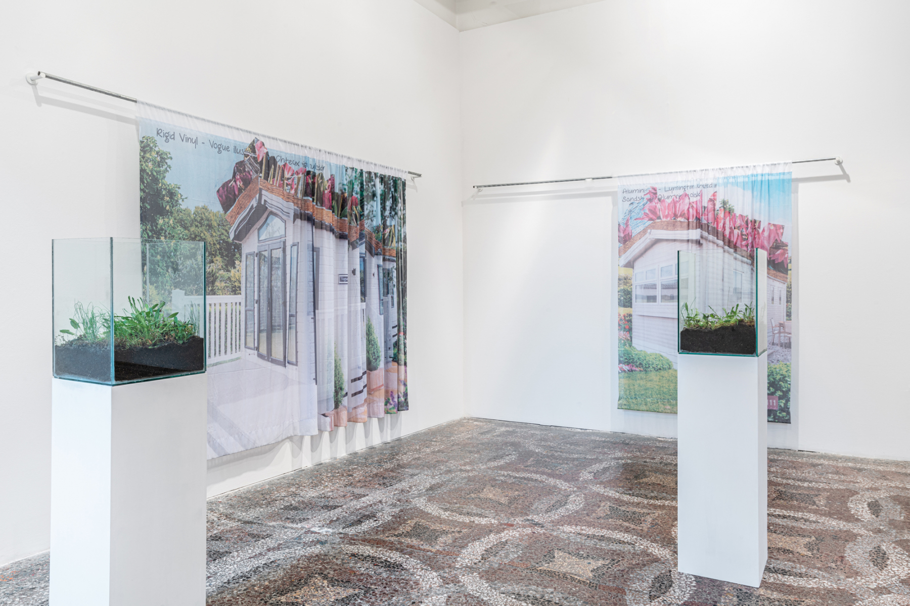 Wood, metal ultraviolet lighting, glass, soil, green roof substrate and capillary matting ,wildflowers and printed voiles