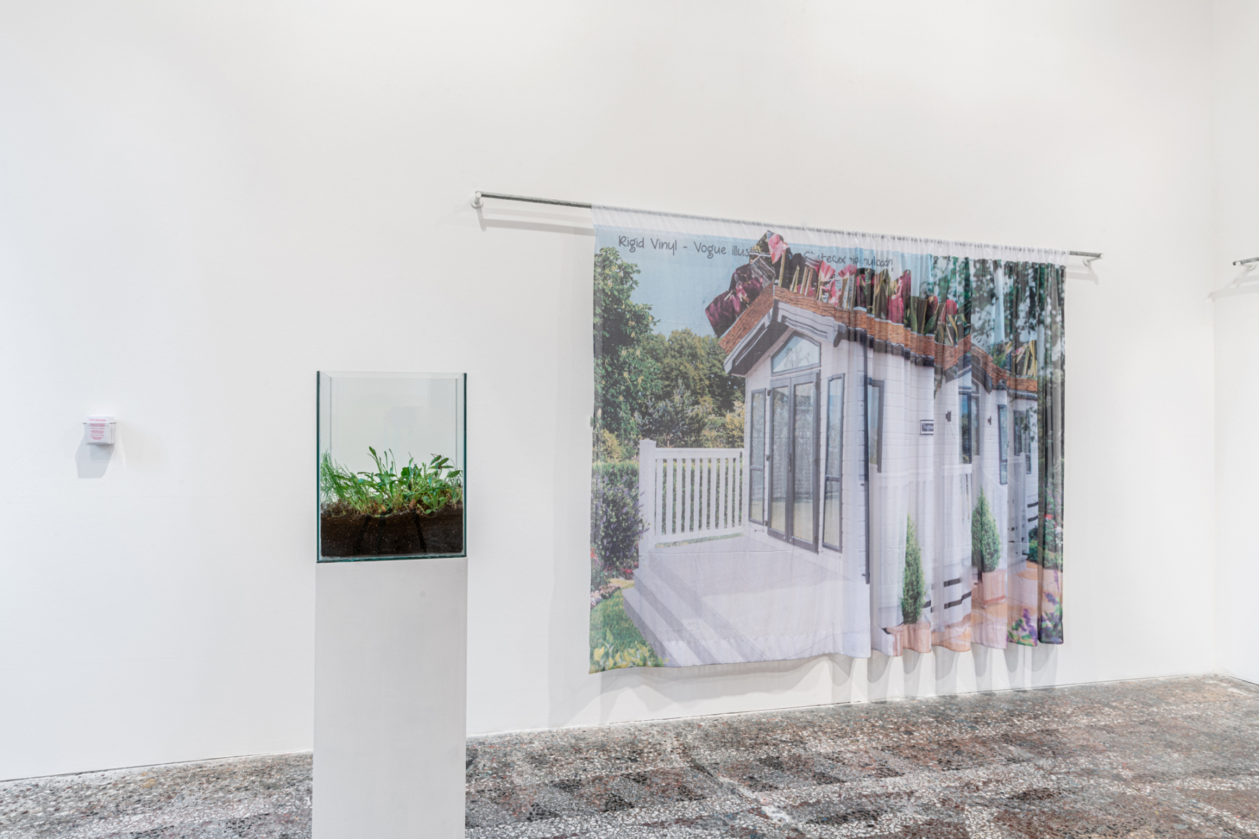 Wood, metal ultraviolet lighting, glass, soil, green roof substrate and capillary matting ,wildflowers and printed voiles